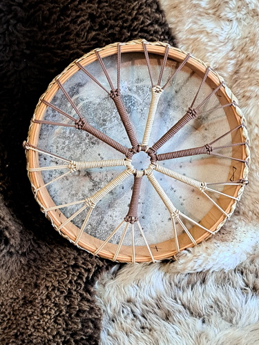 ✨ Details & Materialien Rahmenholz: Buche, rund – stabil und erdig Trommelhaut: Hirsch, Verspannung: braun & weiß.