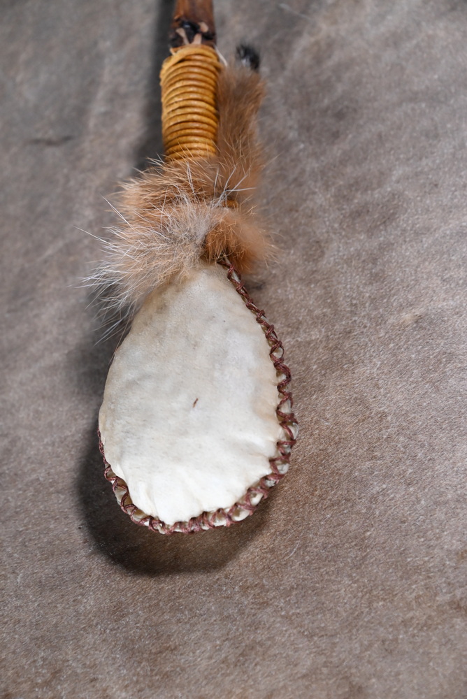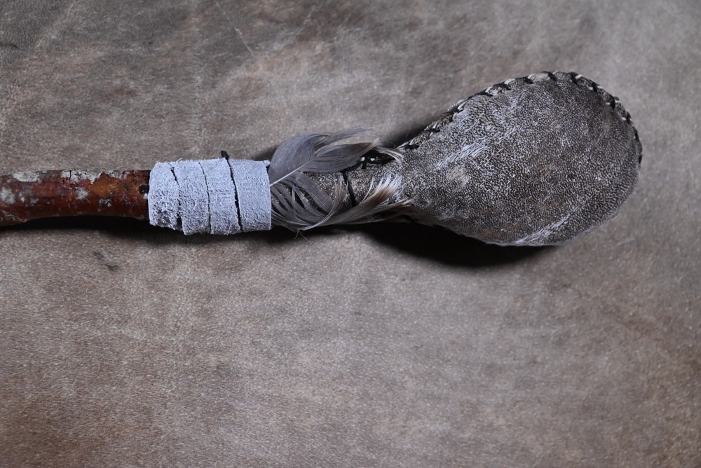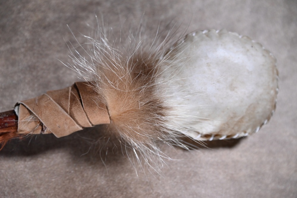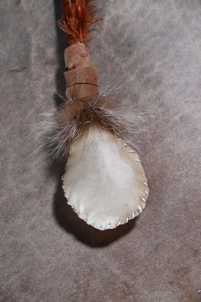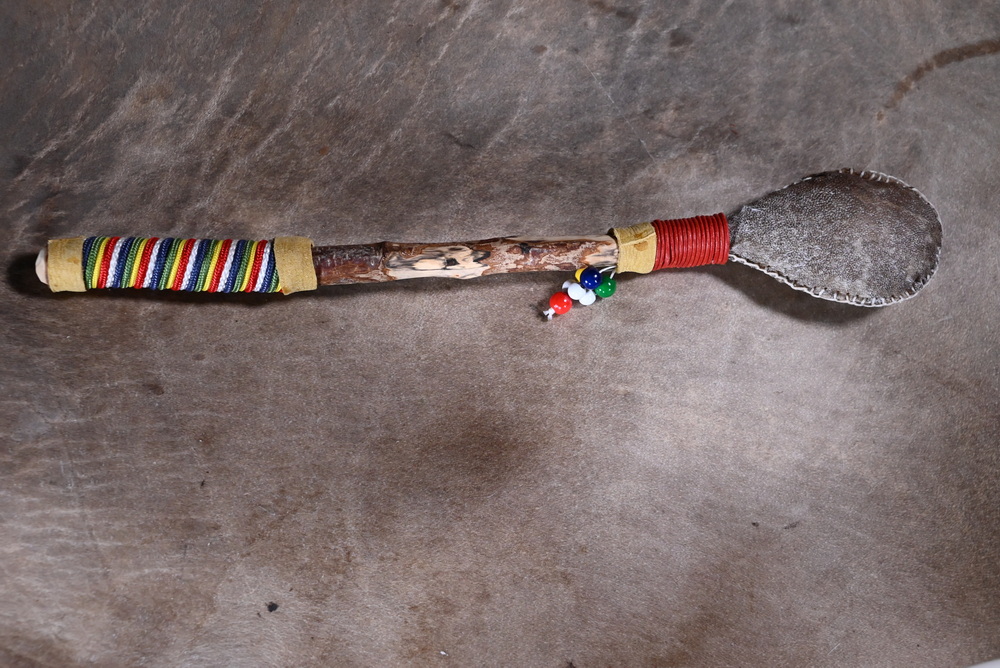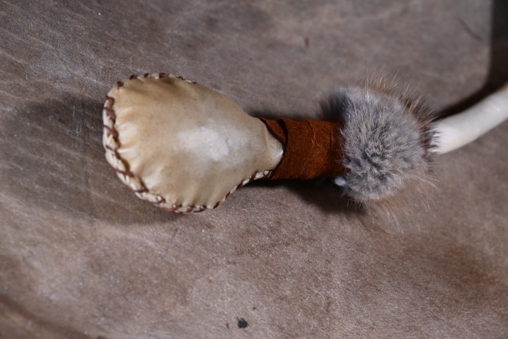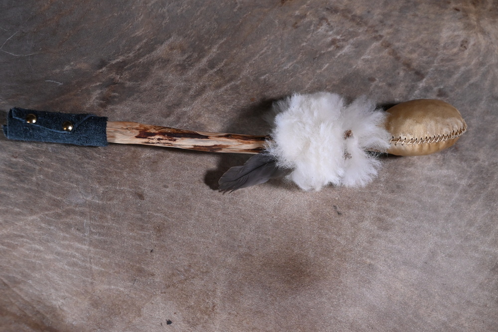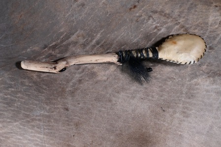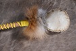 Die Häute sind vom Pferd, Hirsch oder Ziege, die Füllungen variieren von Trauben- und Kirschkernen, Holzperlen und verschiedenen Kristallen wie Bergkristall, Amethyst und mehr. Die Stecken sind aus Hölzern, die wir unterwegs gefunden haben und uns angesprochen haben.