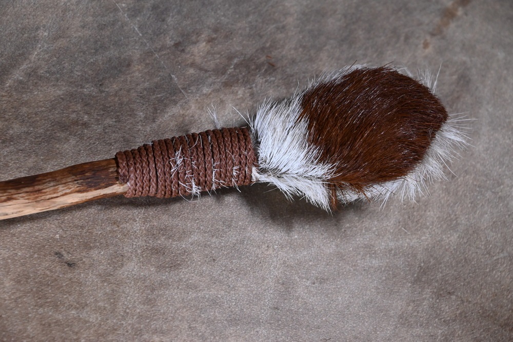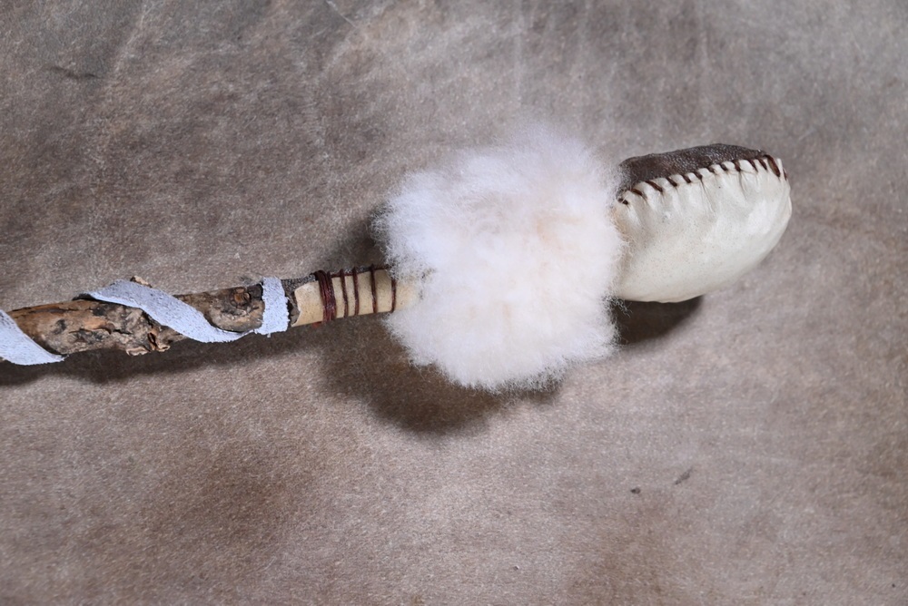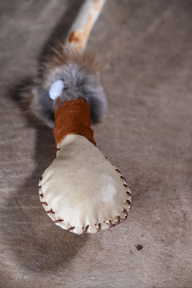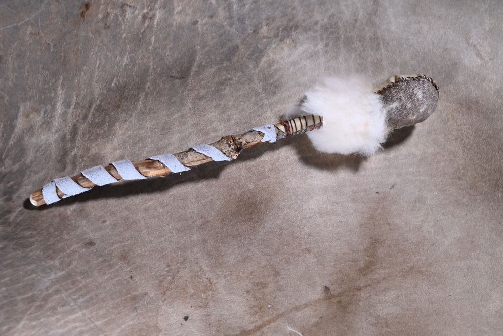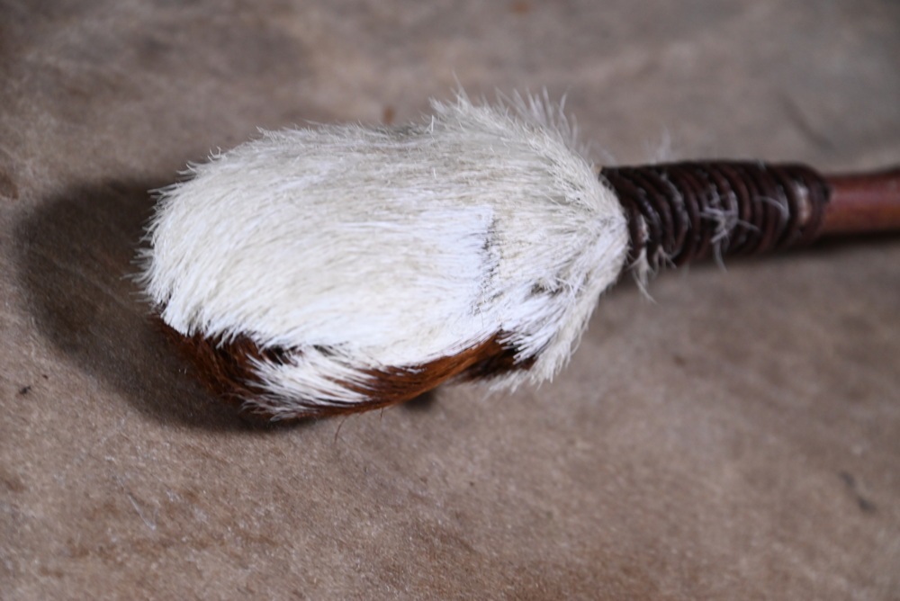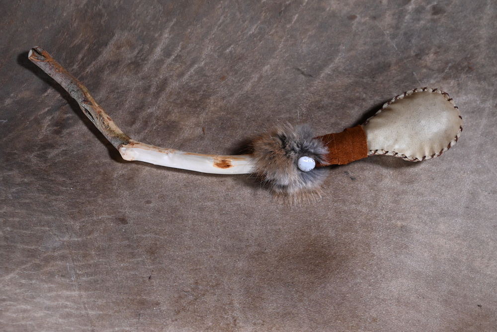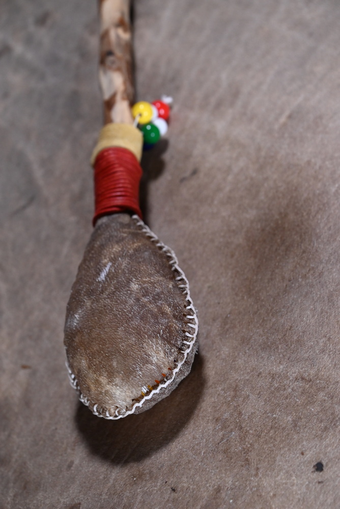 Die Häute sind vom Pferd, Hirsch oder Ziege, die Füllungen variieren von Trauben- und Kirschkernen, Holzperlen und verschiedenen Kristallen wie Bergkristall, Amethyst und mehr. Die Stecken sind aus Hölzern, die wir unterwegs gefunden haben und uns angesprochen haben.