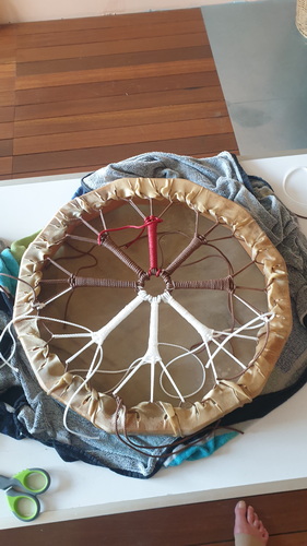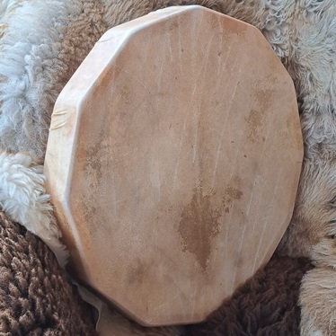 ✨ Details & Materialien Rahmenholz: Buche, 12-eckig – stabil und erdig Trommelhaut: Ziege, mit sichtbaren Spuren des gelebten Lebens Verspannung: braun & weiß & rot – Symbole für Erdung, Leichtigkeit und Begeisterung und einem Hauch von Feuer